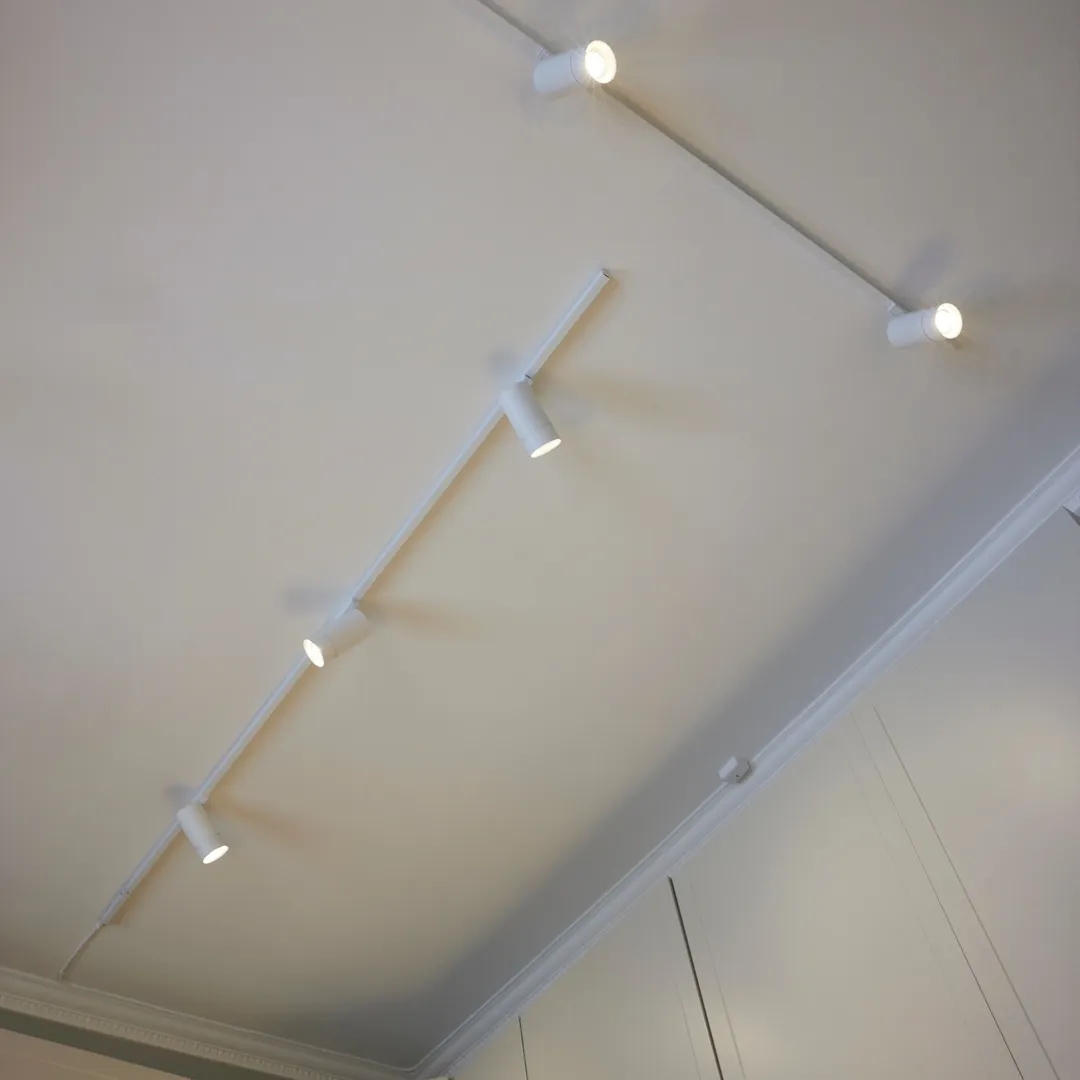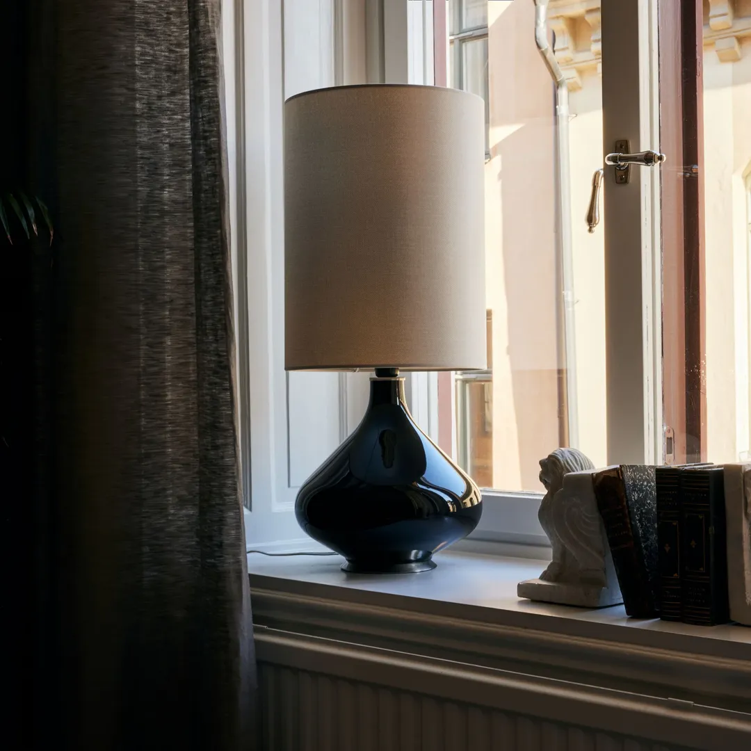 Gardiner syddes upp efter rummens mått och anpassades noggrant efter stuckatur och taklinjer, vilket gav en mjuk och självklar inramning till fönstren. Belysningen valdes för att lyfta rummens volym och skapa rätt stämning under hela dagen.